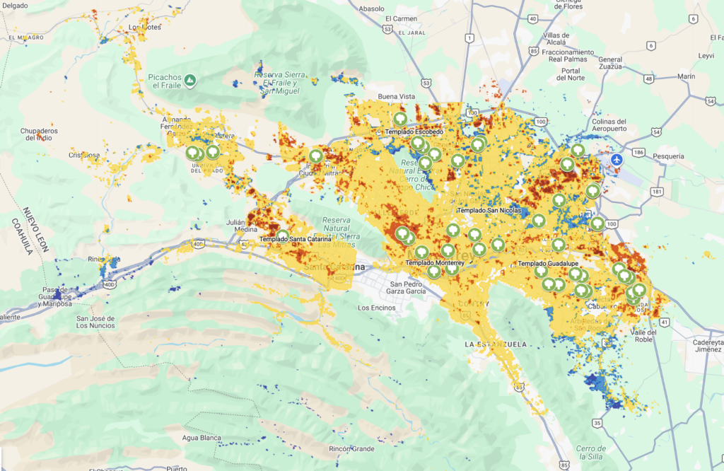 En este mapa se ven reflejadas aquellas zonas que son calientes o muy calientes en el AMM, además de los árboles que han sido plantados por los municipios para mitigar el calor.